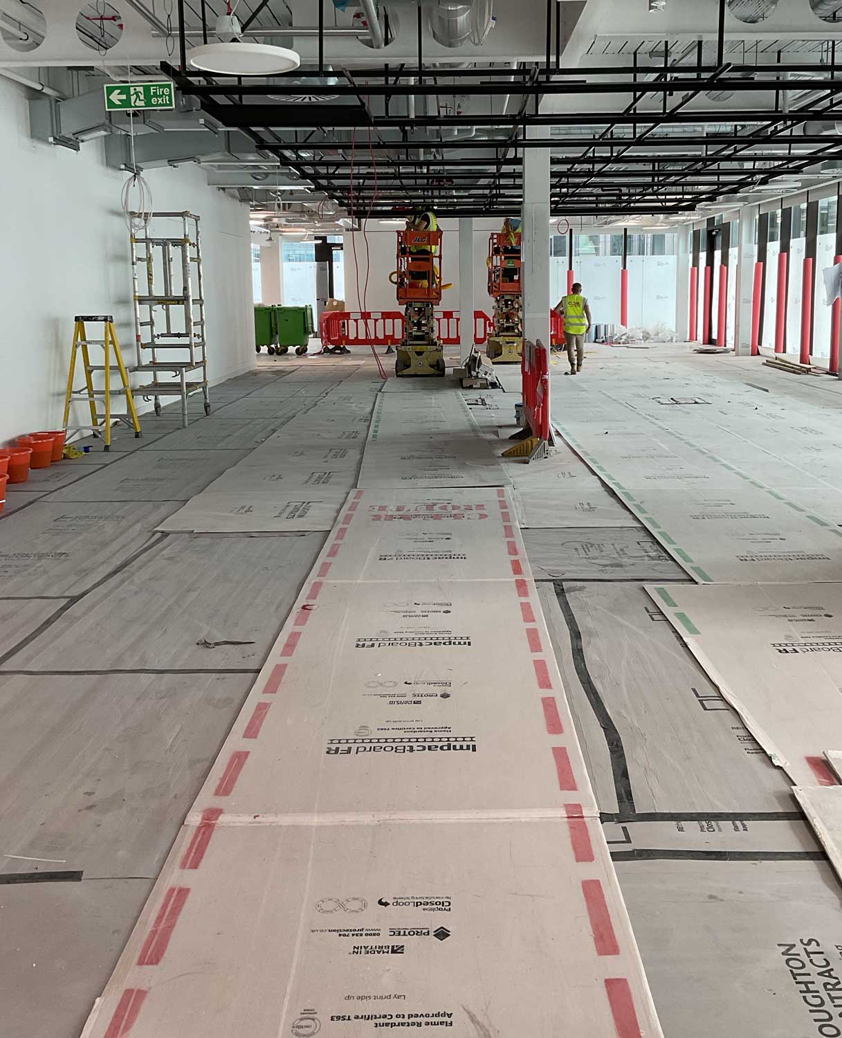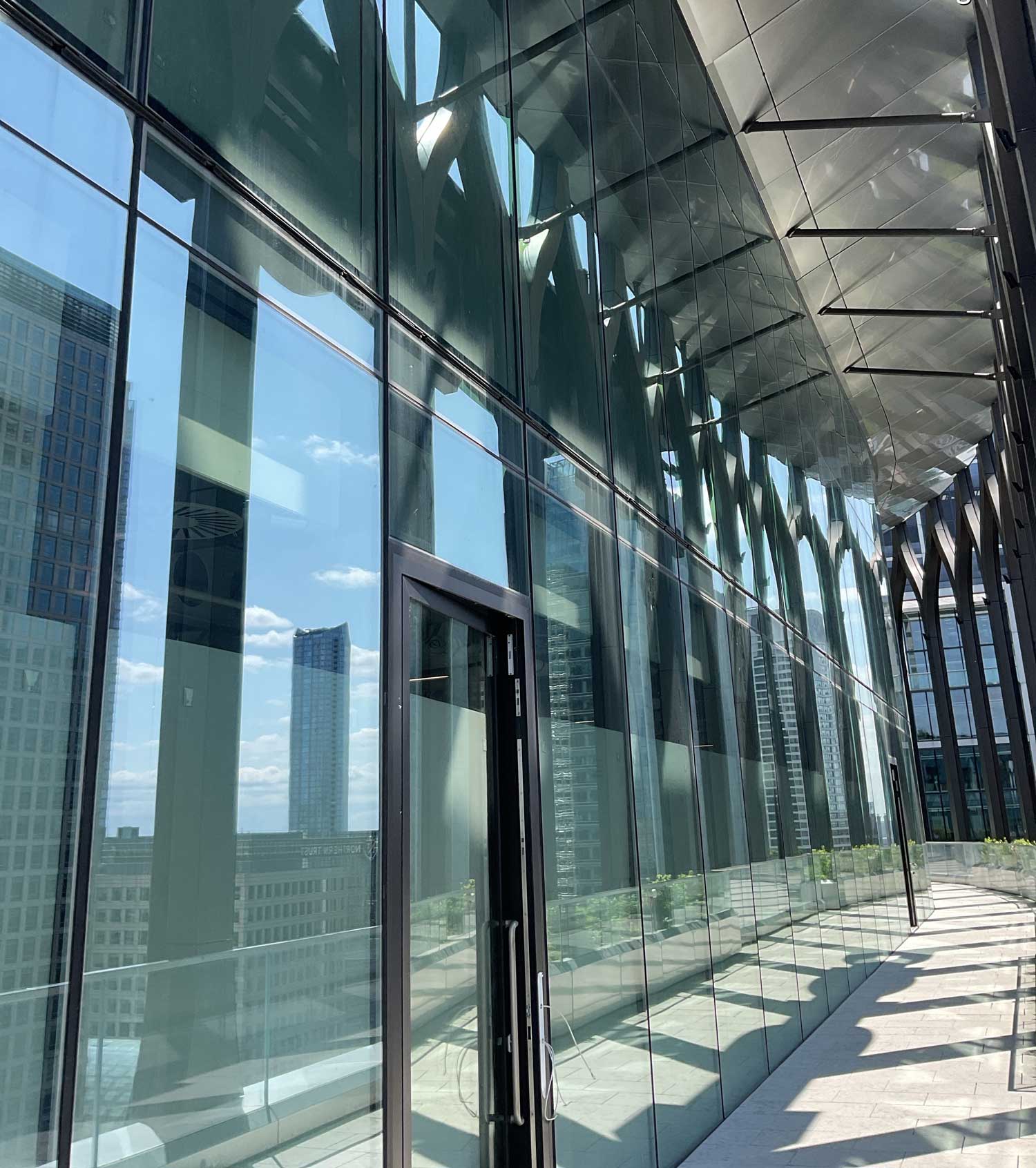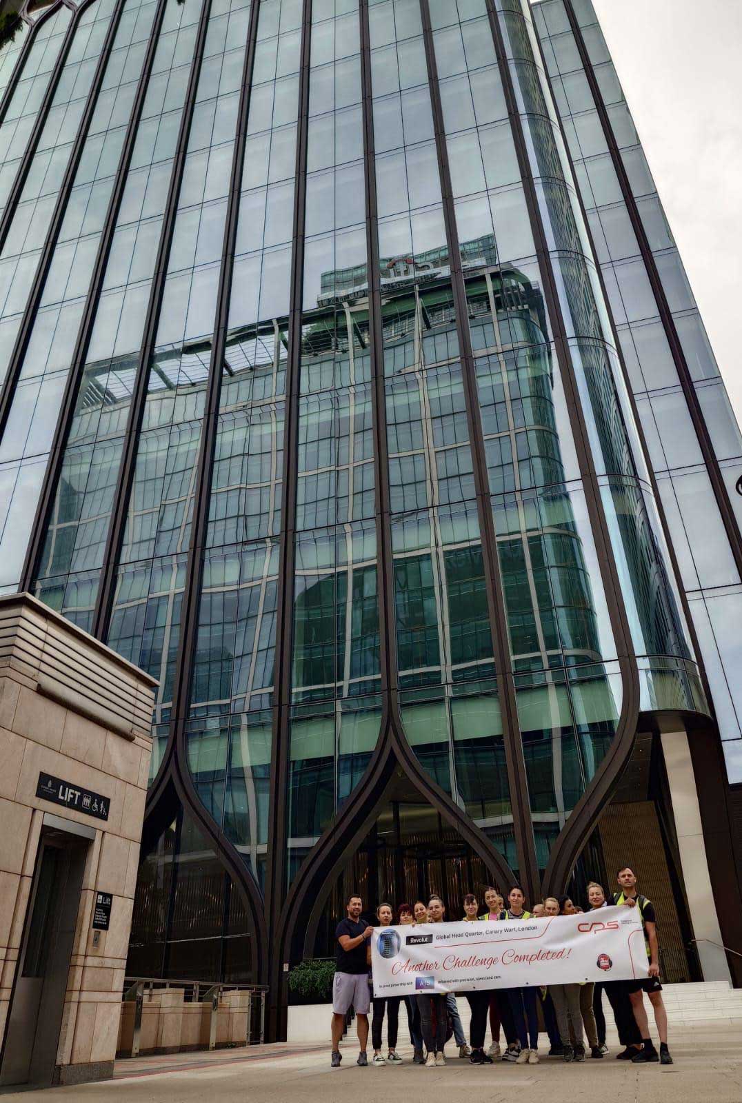 The outcome of cleaning the Revolut building in Canary Wharf was a spotless, hygienic, and well-maintained environment which supports the building’s high-end aesthetic and sustainability goals. Given the building’s cutting-edge design and focus on eco-friendliness, the cleaning process aimed to achieve a pristine appearance of all surfaces and areas from glass façade , high level exposed services, to polished floor which were cleaned to maintain a modern, sleek look that aligns with Revolut’s brand image and the buildings’ luxurious design.